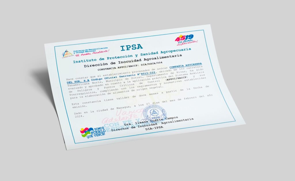 Compañía Azucarera del Sur, S. A., se certifica en Análisis de Peligros y Puntos Críticos de Control HACCP (Hazard Analysis and Critical Control Points).
