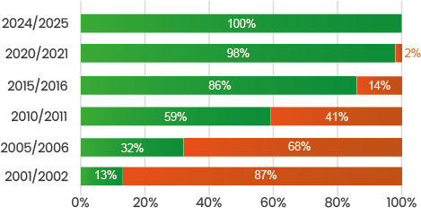 Desde el año 2001, Monte Rosa muestra una clara evolución en la adopción de tecnologías mecanizadas en el proceso de corte, comparando los métodos mecanizado y manual.